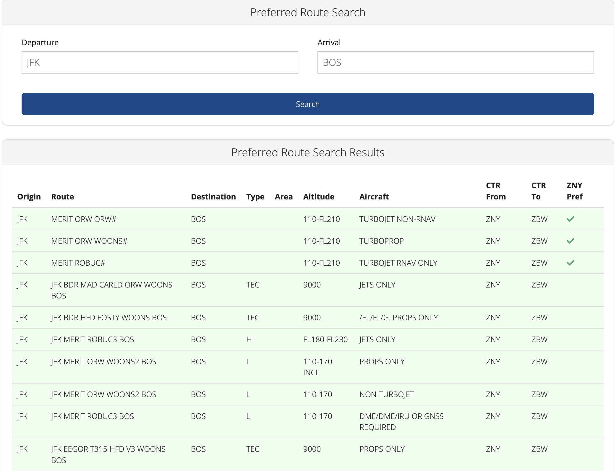 - There is something very interesting about the JFK-BOS PRD routing. Notice how the first four routes all have checkmarks. This indicates that these routes are higher priority than the other routes. This essentially means that these routes are agreed upon by multiple facilities in the form of an LOA, SOP, or some other facility directive. When at all possible, you must assign one of these routes to the pilot.
