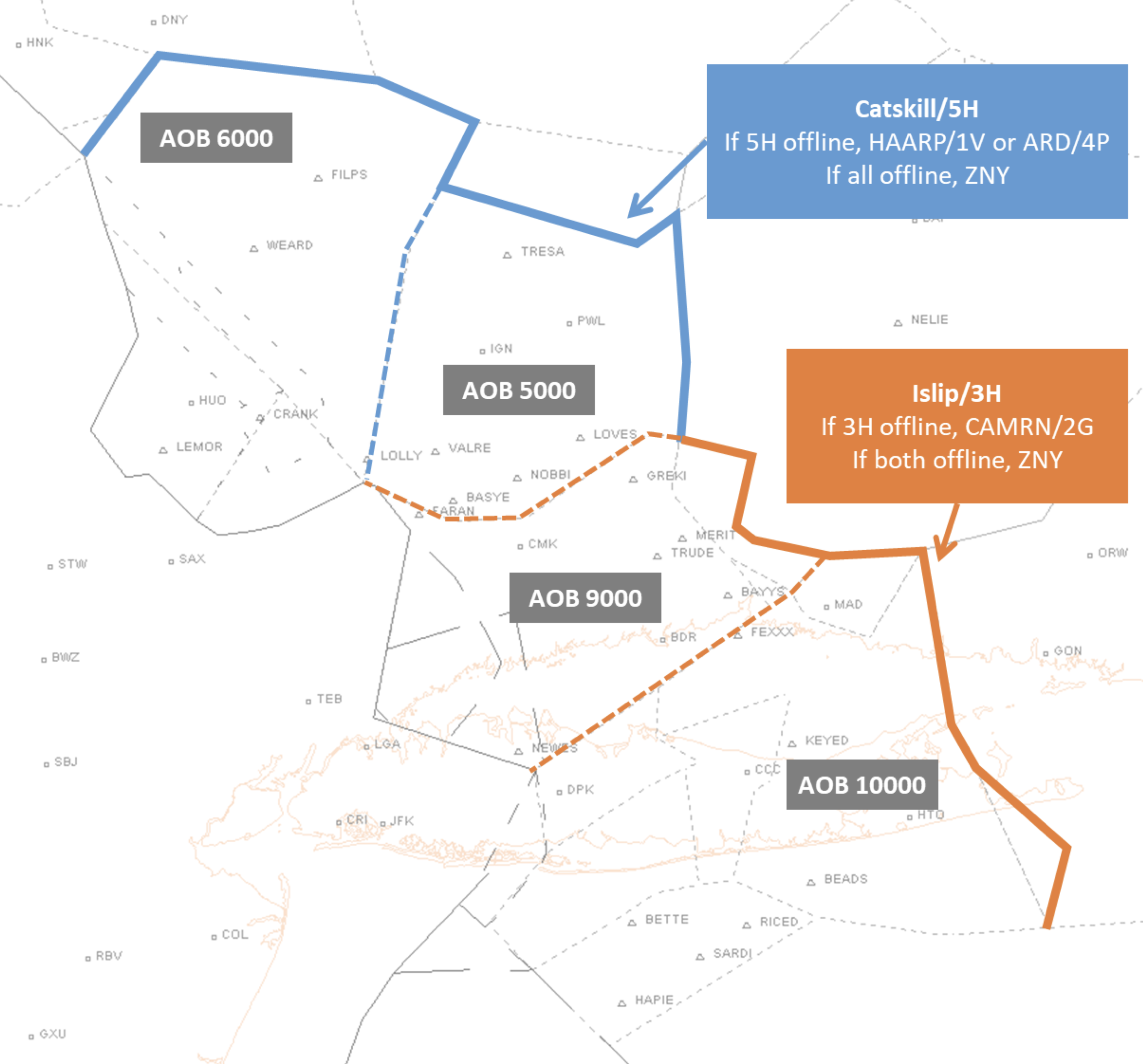 | KFRG | ZNY-34 AOA FL240 | HNK or CFB | AOB FL270, descending FL240 |